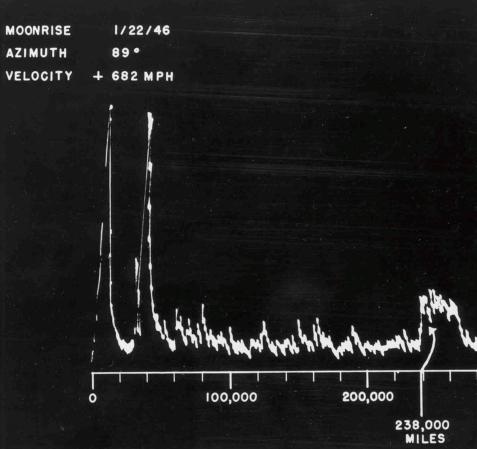 Oscilloscope display of the radar signals: transmitted signal on the left and radar return on the right. The arrow at right shows the distance in miles to the moon.